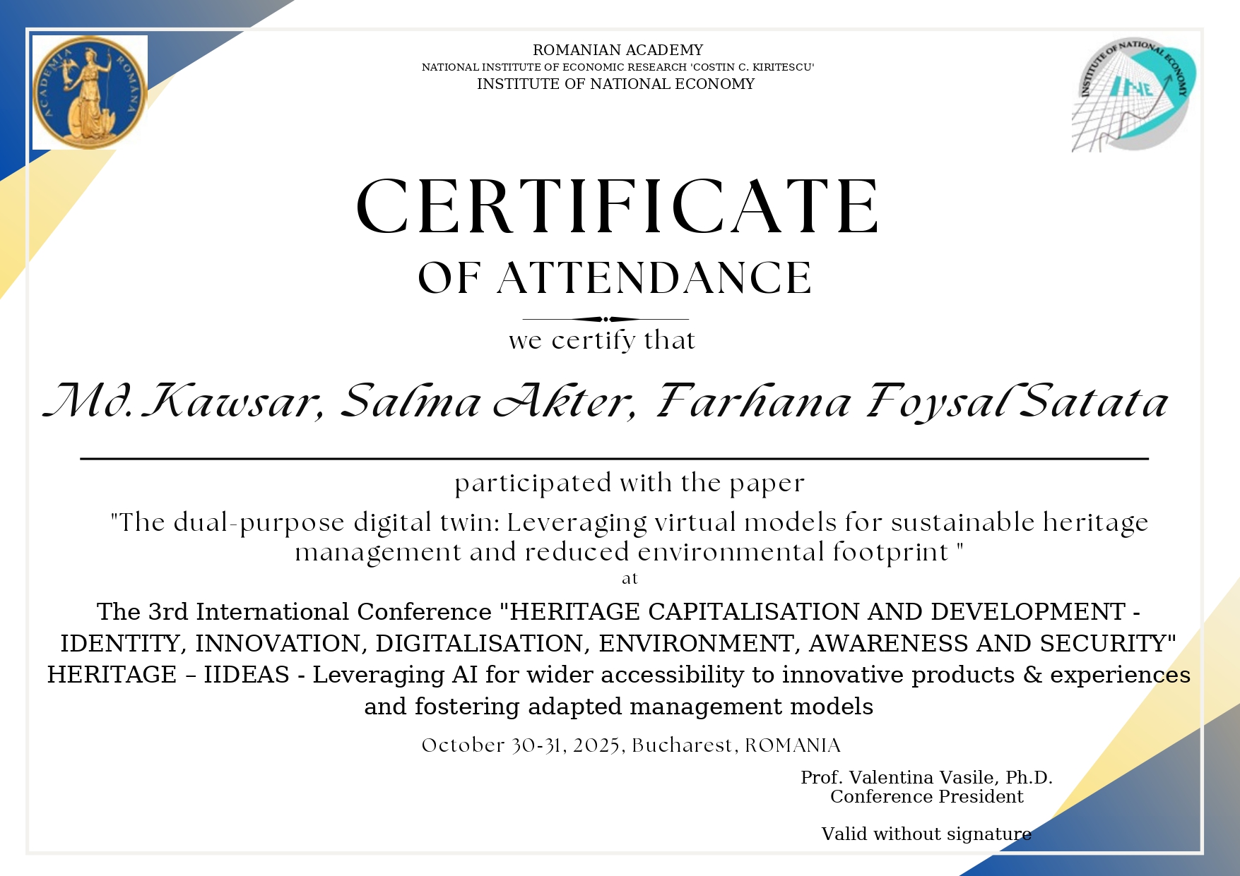 11) Kawsar, M. Akter, S. and Satata , F.F. (2025) The Dual-Purpose Digital Twin: Leveraging Virtual Models for Sustainable Heritage Management and Reduced Environmental Footprint. INTERNATIONAL CONFERENCE "HERITAGE CAPITALISATION AND DEVELOPMENT-IDENTITY, INNOVATION, DIGITALISATION, ENVIRONMENT, AWARENESS AND SECURITY" - (HERITAGE – IIDEAS) 2025, under topic-5. INNOVATION IN HERITAGE CAPITALIZATION IN THE CONTEXT OF TWIN TRANSITION (GREEN & DIGITAL). ROMANIA.
