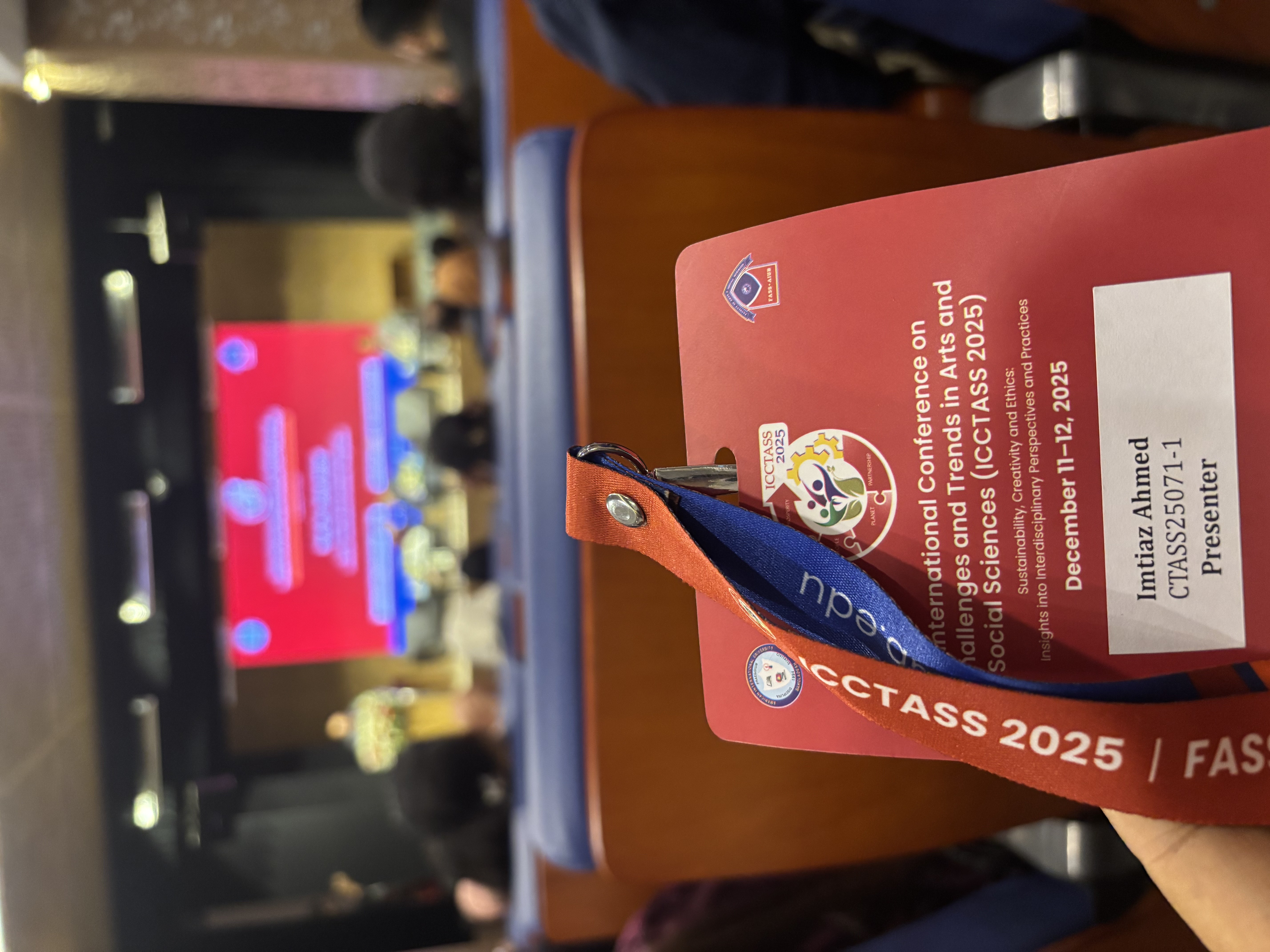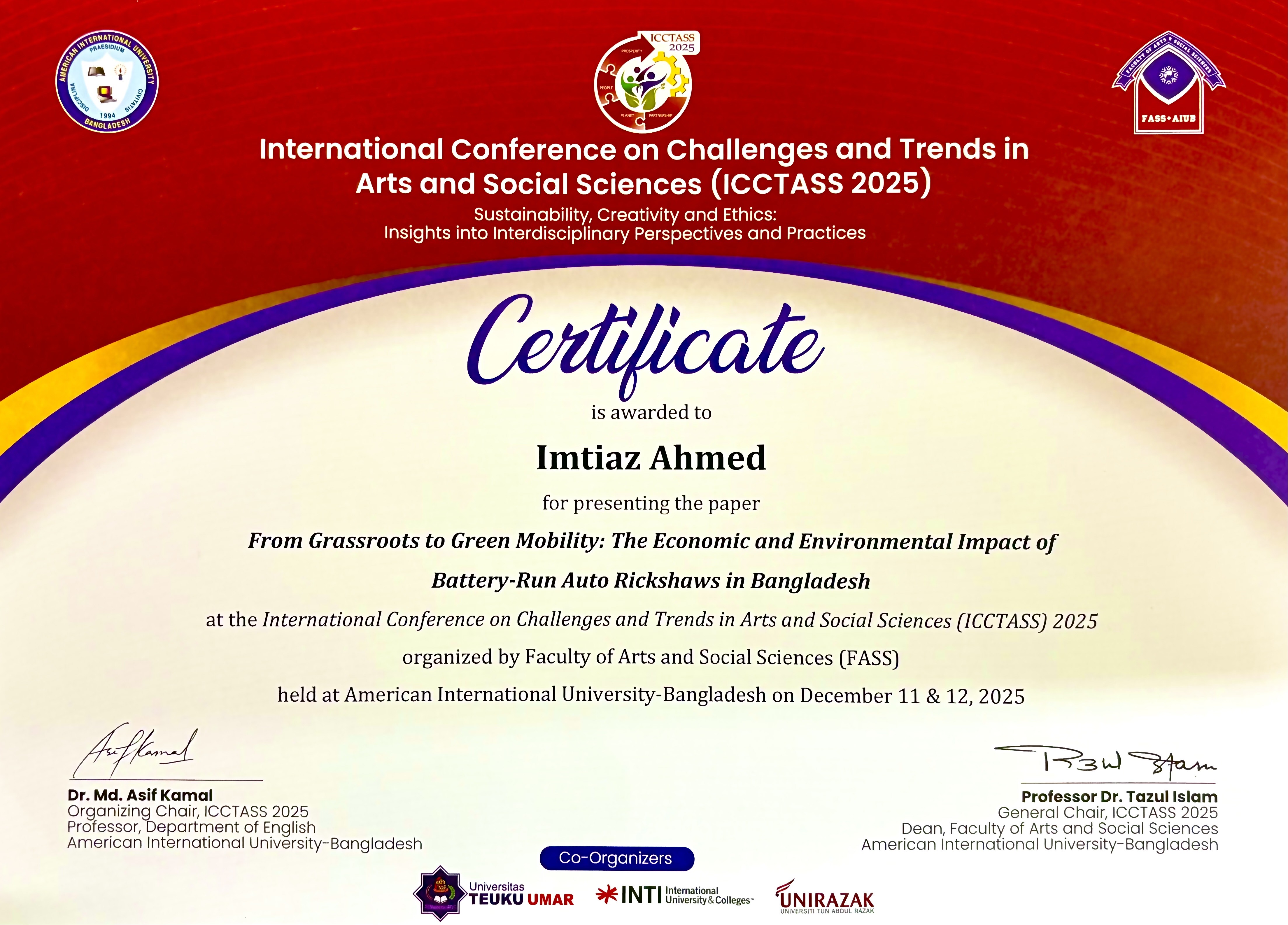 Imtiaz Ahmed, a 4th-semester student (ID: 2024-3-10-070), successfully presented his solo research paper titled “From Grassroots to Green Mobility: The Economic and Environmental Impact of Battery-Run Auto Rickshaws in Bangladesh” at the International Conference on Challenges and Trends in Arts and Social Sciences (ICCTASS 2025), held on December 11–12, 2025, at AIUB. He independently conducted the data collection, analysis, and drafting under the academic guidance of Md. Shafiqul Islam, Senior Lecturer, Department of Business Administration, is bringing recognition to the department through this scholarly contribution.