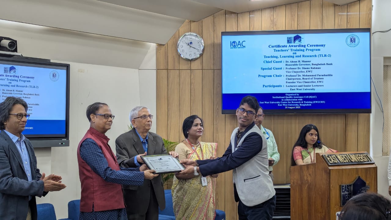 6) Completed certified faculty teaching training program on “Training on Teaching, Learning, and Research (TLR)” organized by Institutional Quality Assurance Cell (IQAC) in collaboration with East West University Center for Research and Training (EWUCRT). April 2025-August, 2025.