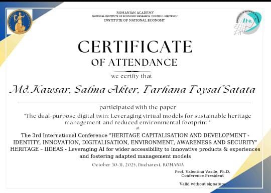 2) Kawsar, M., Akter, S. and Satata, F.F. (2025) The Dual-Purpose Digital Twin: Leveraging Virtual Models for Sustainable Heritage Management and Reduced Environmental Footprint [Conference presentation]. INTERNATIONAL CONFERENCE "HERITAGE CAPITALISATION AND DEVELOPMENT-IDENTITY, INNOVATION, DIGITALISATION, ENVIRONMENT, AWARENESS AND SECURITY" - (HERITAGE – IIDEAS) 2025, under topic-5. INNOVATION IN HERITAGE CAPITALIZATION IN THE CONTEXT OF TWIN TRANSITION (GREEN & DIGITAL). ROMANIA.