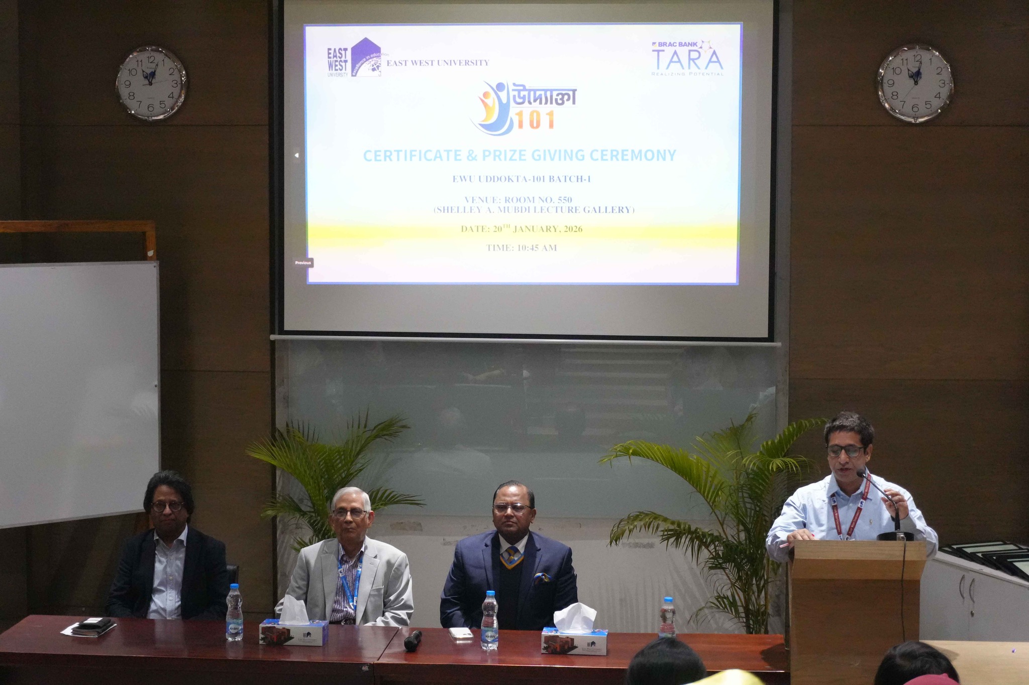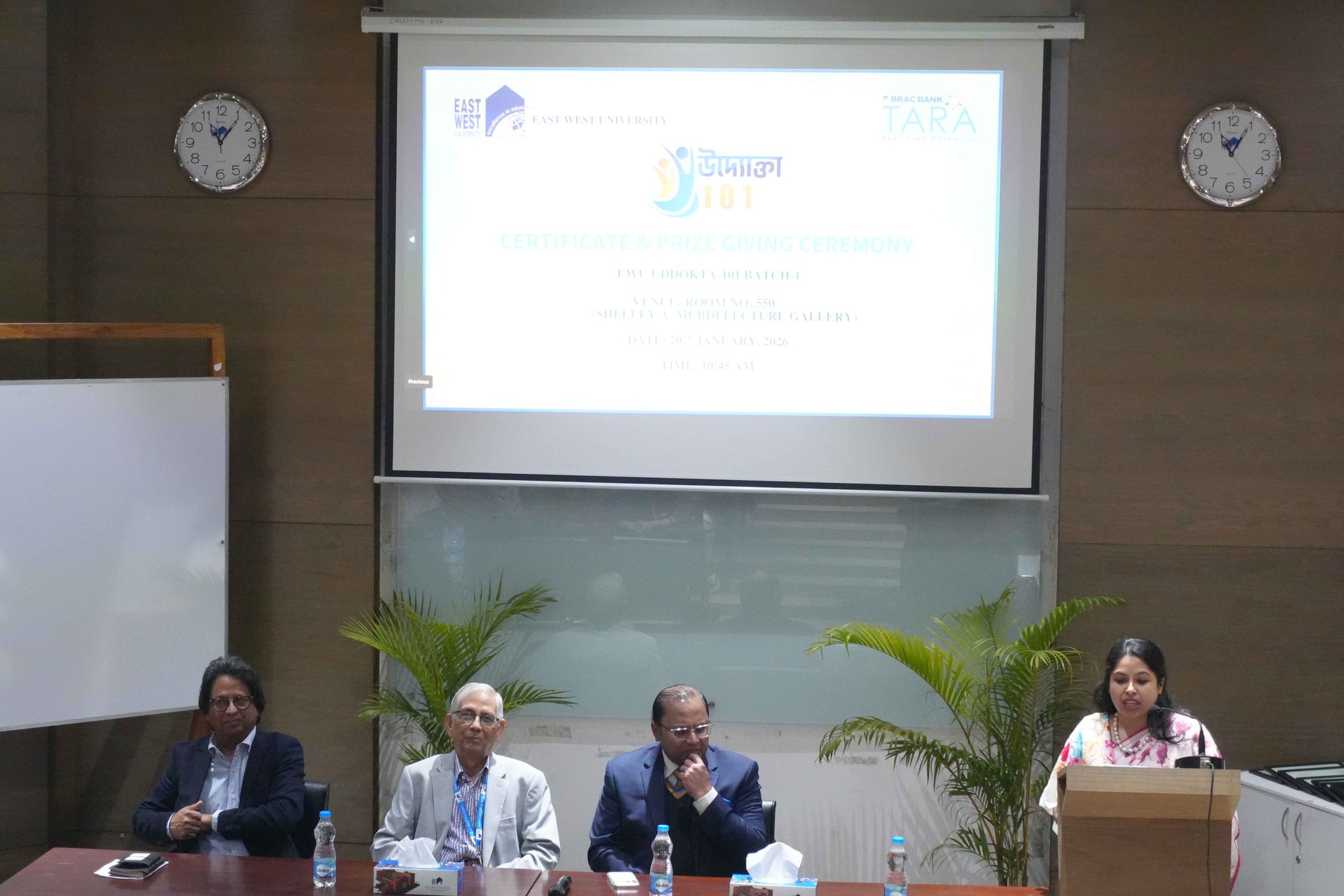 The Department of Business Administration at East West University (EWU) has organized the Certificate and Prize Giving Ceremony for its "Uddokta 101" certificate course. The event was held at the Shelley A. Mubdi Lecture Gallery, EWU, on 20 January 2026.