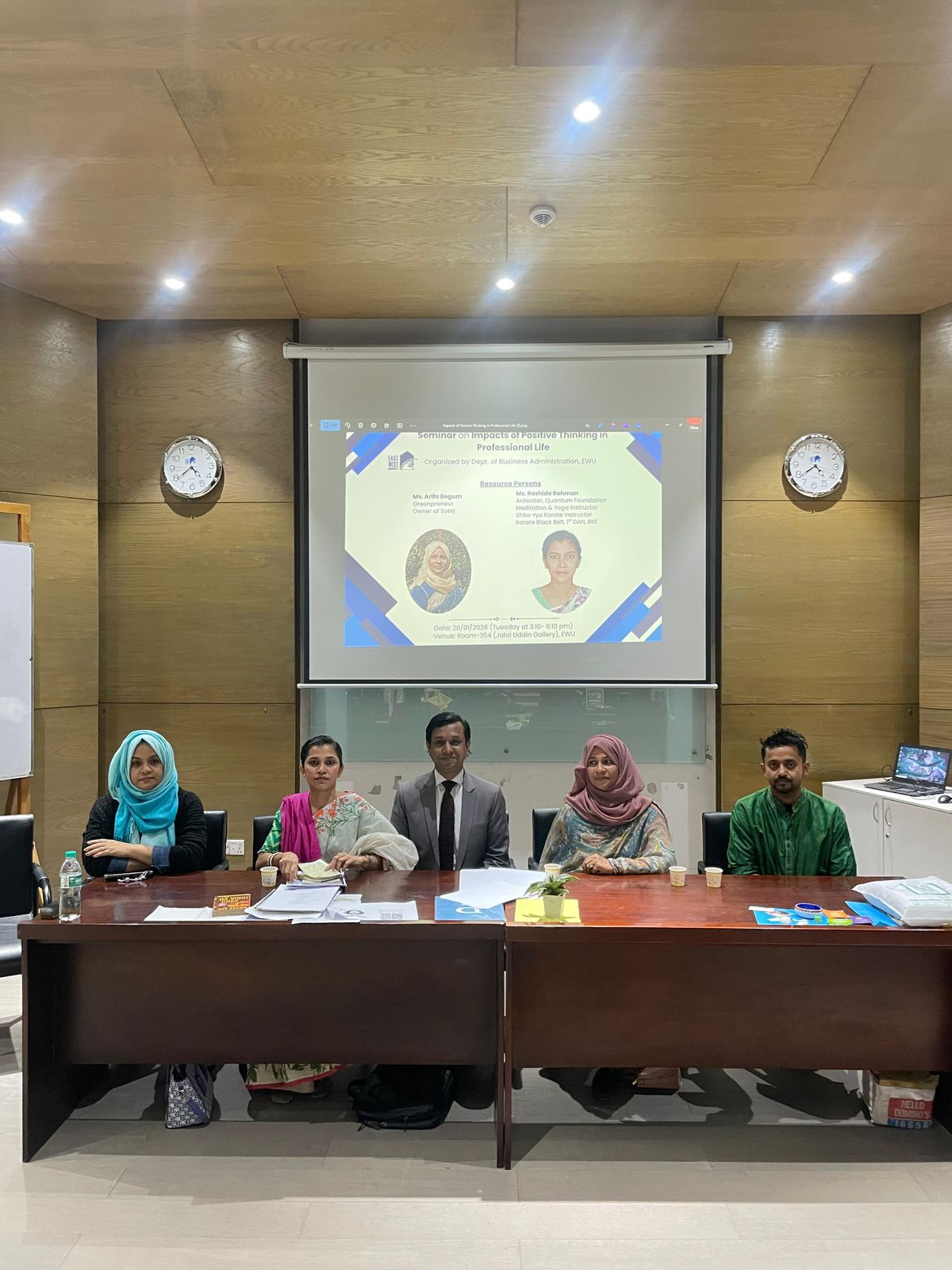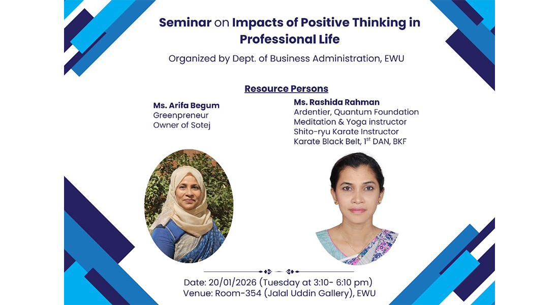 The East West University Department of Business Administration hosted a seminar on “Impact of Positive Thinking on Professional Life” on Tuesday 20th January, 2026 from 3:10 to 6:10 pm at the university campus.