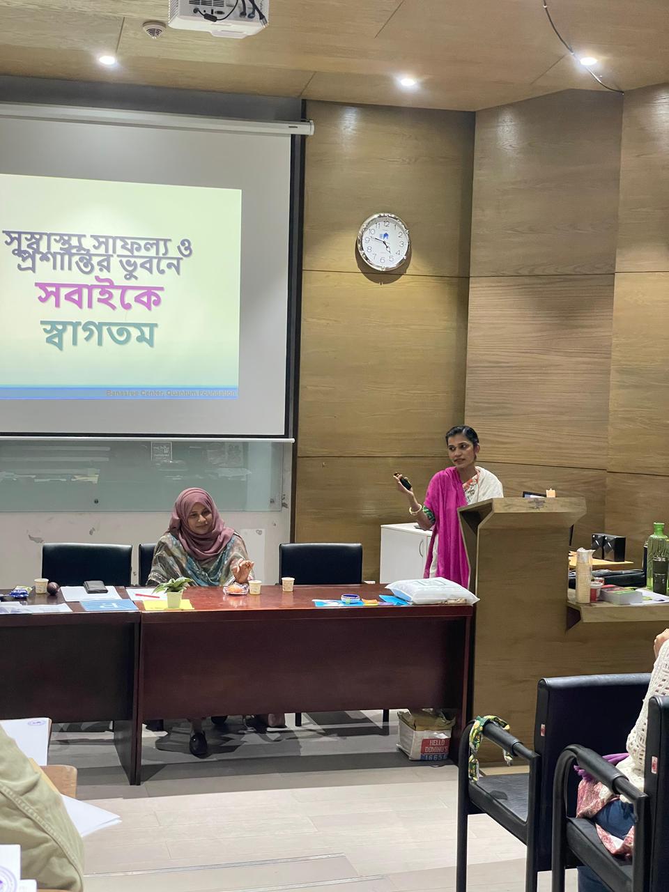 On the other hand, Ms. Rashida Rahman showed the students how to be positive despite all trouble in life. She emphasized the importance of mental and physical health and how to keep them both sound and balanced. She also showed the students how to maintain proper work and life balance. Lastly, she showed how to meditate, and all the students practiced meditation with her as part of employee wellbeing program which is commonly known as Employee Assistance Program (EAP) in Human Resource Management. Mr. Siddiquee spoke with students individually and gave career related advice.