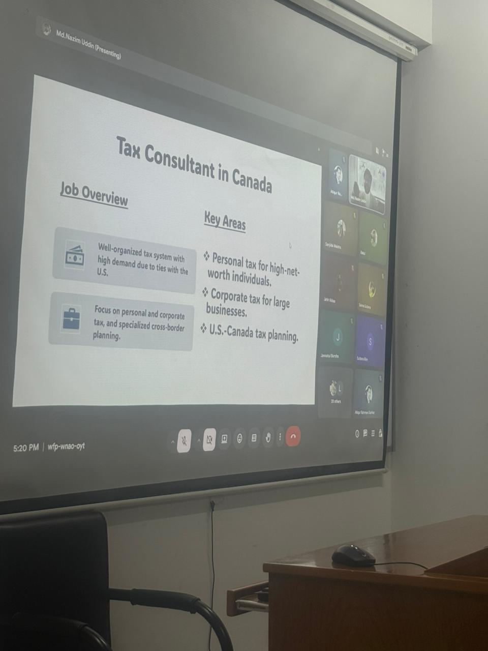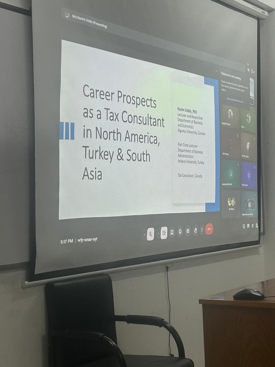 Students of HRM 301 as well as students from other HRM courses participated in this webinar. At 5 pm, the webinar started. The resource person for this webinar was Dr. Nazim Uddin, who is a lecturer at Department of Business and Economics, Algoma University, Toronto. By profession, Dr. Uddin is also a tax consultant in Canada as well as a part time lecturer at Ankara University, Turkey. The webinar aimed to provide students the knowledge and insights of future career growth and necessary education for being a tax consultant.