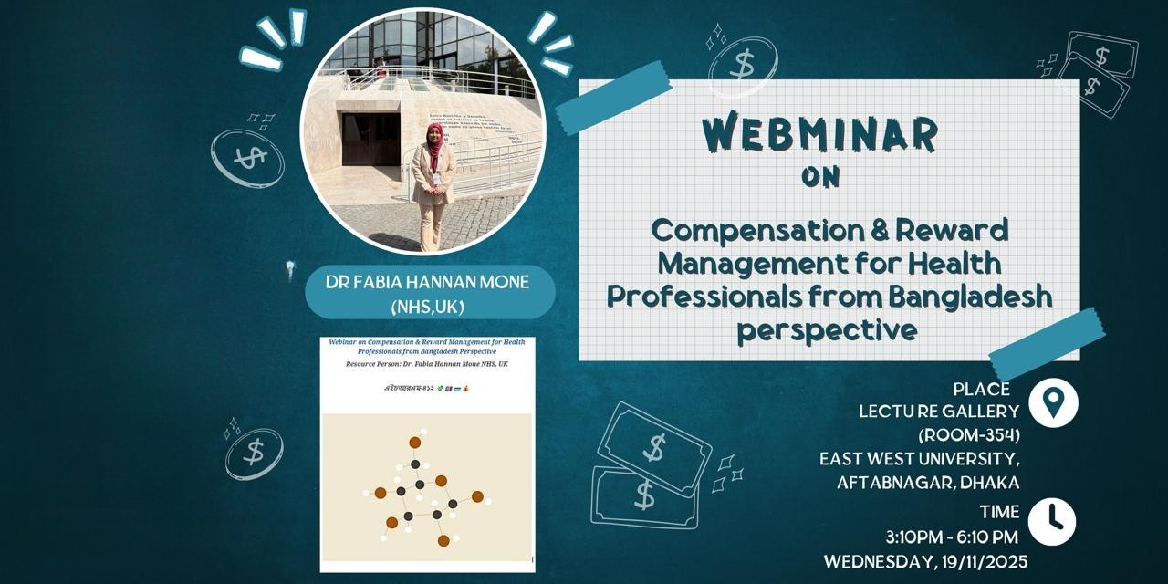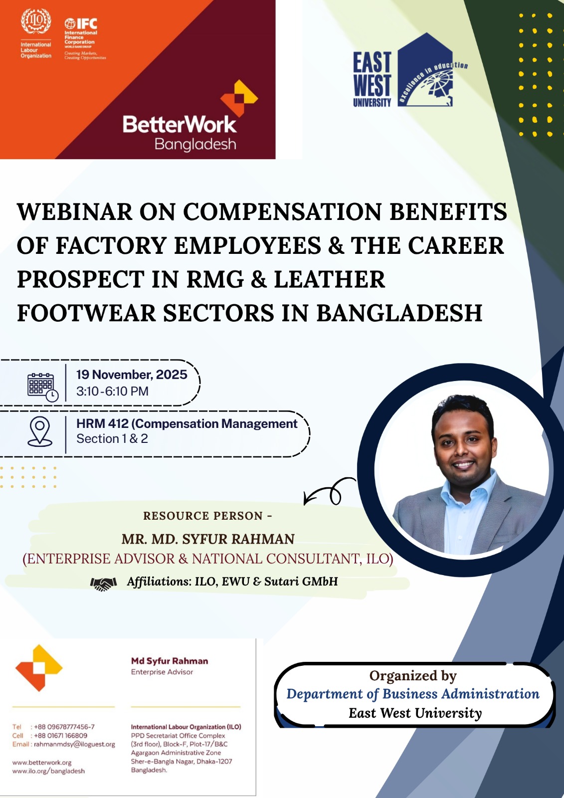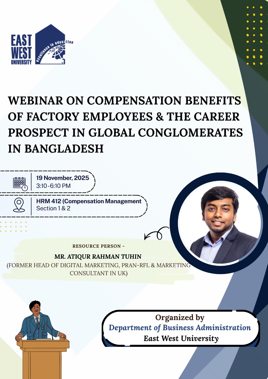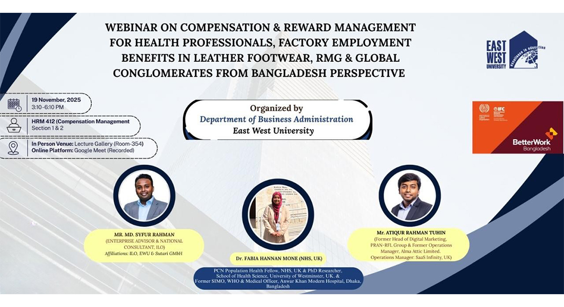 Webinar on “Compensation & Reward Management for Health Professionals, Factory Employment Benefits in Leather Footwear, RMG Sectors & Global Conglomerates from Bangladesh Perspective” has been organized by the Department of Business Administration (DBA), East West University (EWU) on 19th November, 2025 for Human Resource Management (HRM) major students (Students of HRM- 411, HRM-412 & HRM-413 attended the webinar in presence of Faculty Member, Dr. Md. Atiqur Rahman Sarker, Associate Professor, DBA, EWU at Room-354 (Lecture Gallery). The session brought together three distinguished speakers who shared practical experiences and sector-specific compensation insights.