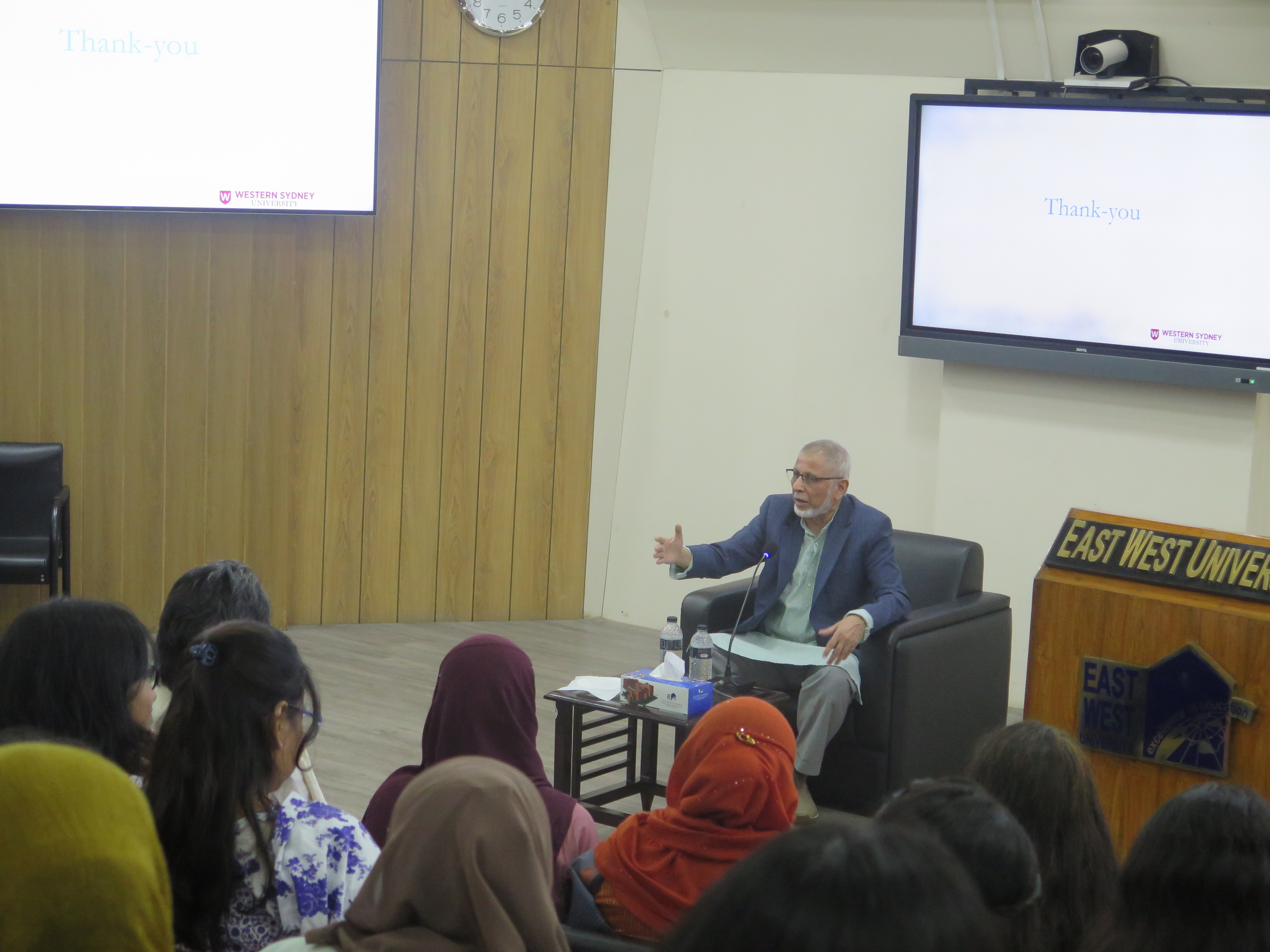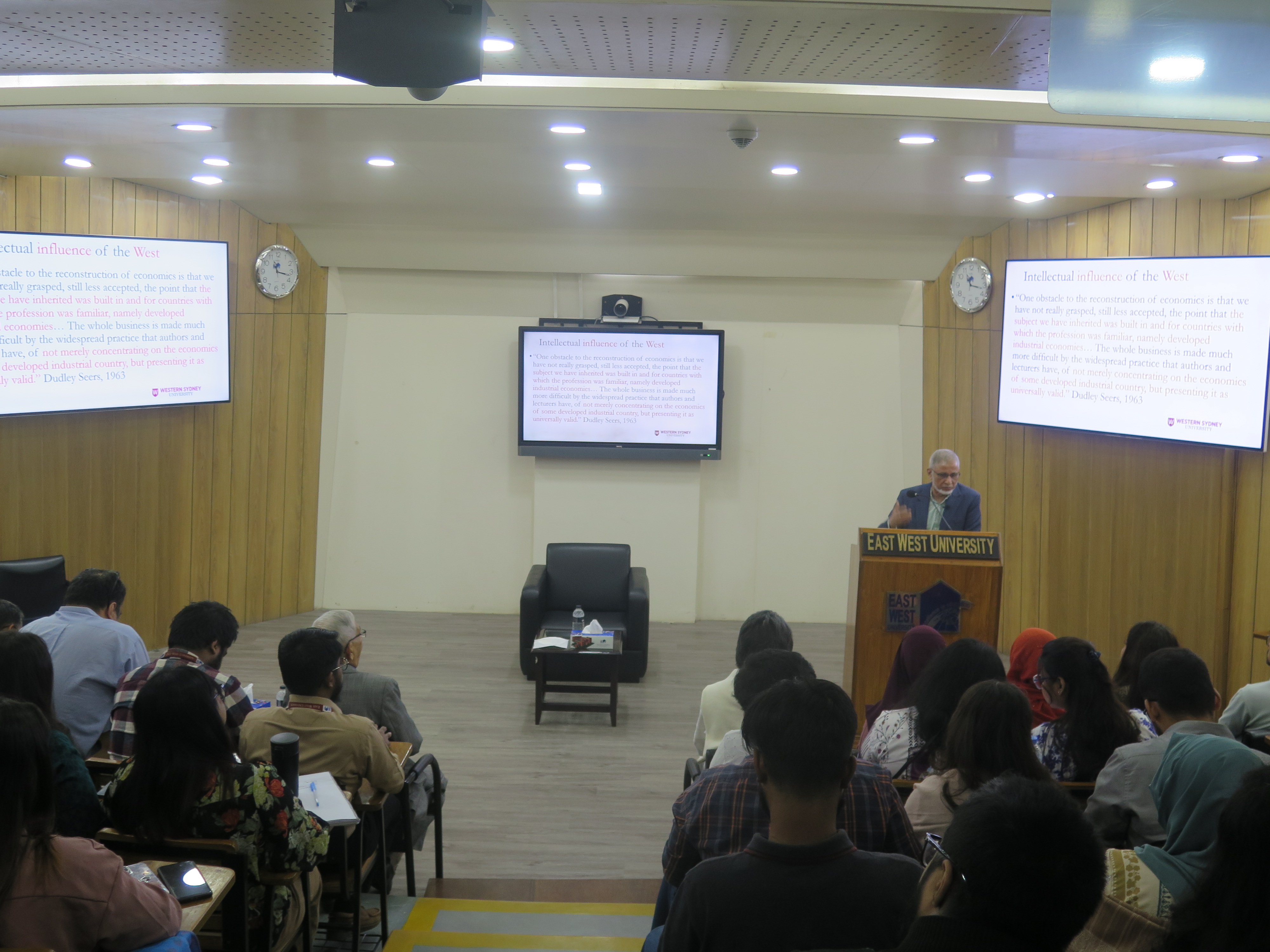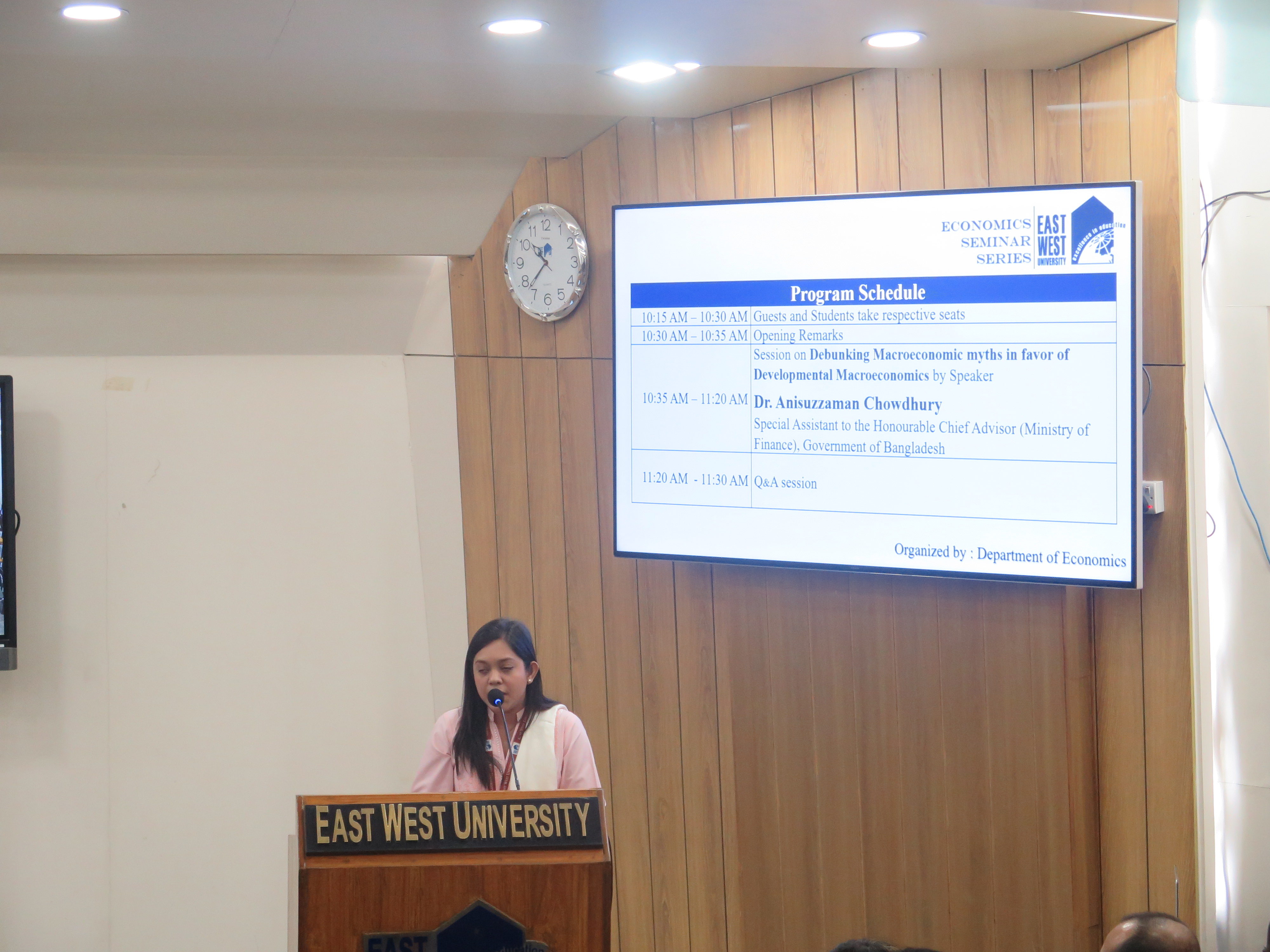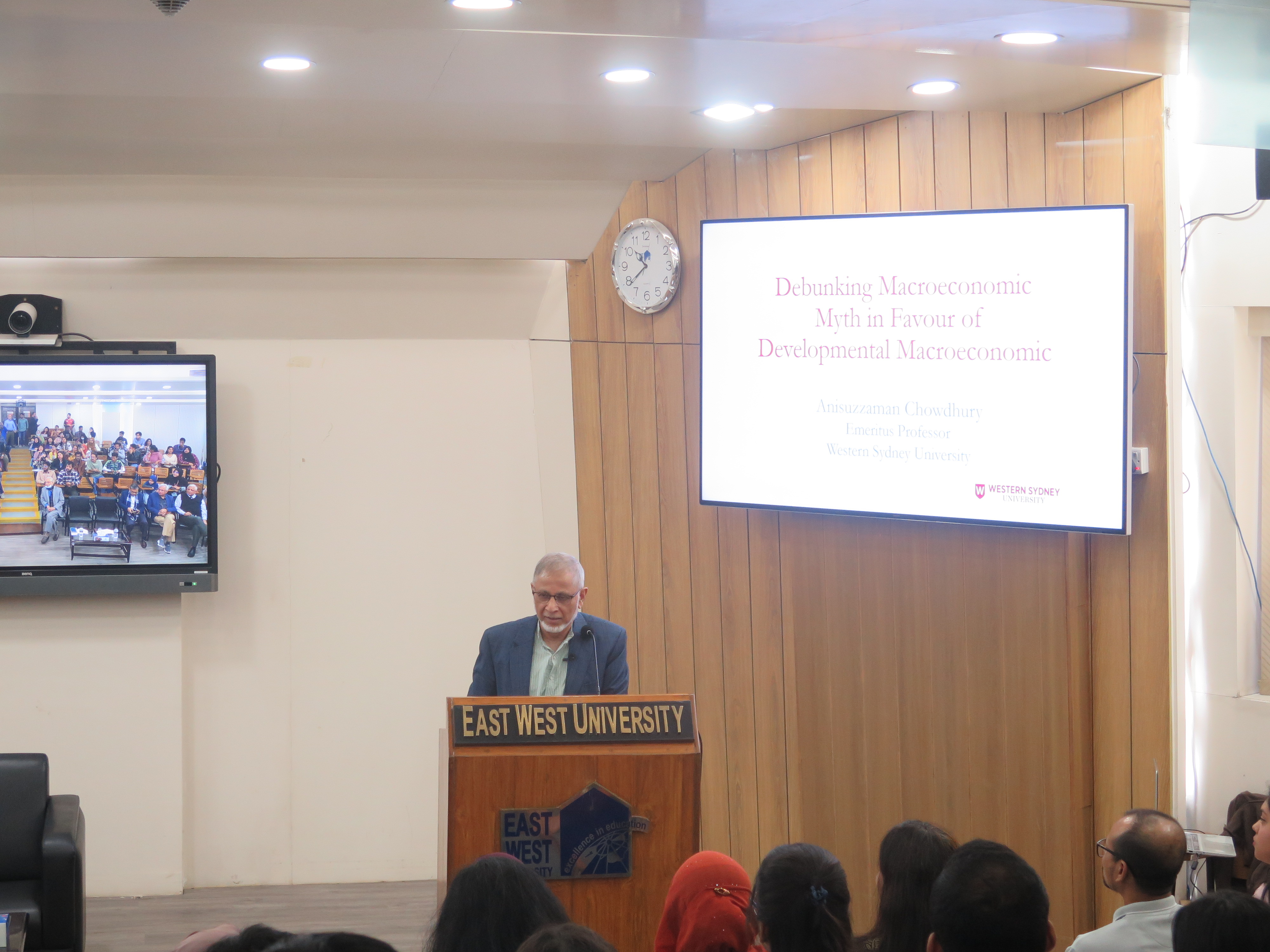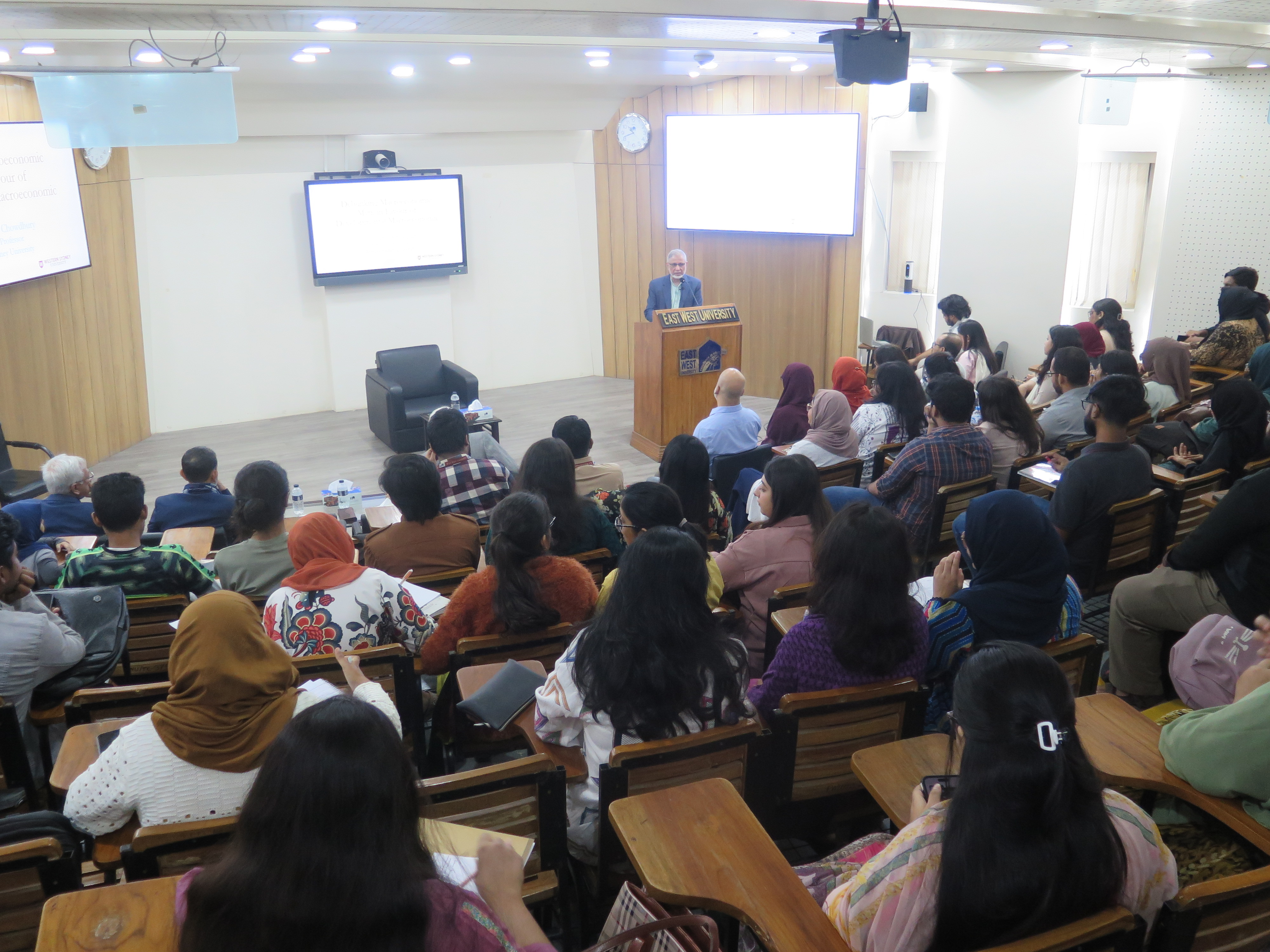 The Department of Economics at East West University (EWU) organized a seminar titled "Debunking Macroeconomic Myths in Favor of Developmental Macroeconomics" on December 6, 2026. The influential event took place at the S.M. Nousher Ali Lecture Gallery of EWU. The seminar featured Professor Anisuzzaman Chowdhury, Special Assistant to the Honourable Chief Advisor (Ministry of Finance), Government of Bangladesh, and Emeritus Professor at Western Sydney University, Australia, as the distinguished speaker. His presentation sparked an engaging discussion on challenging conventional macroeconomic assumptions and promoting policy implications that support a developmental approach worldwide.